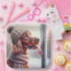 Un perro Setter irlandés con un gorra de punto y una bufanda tiene la lengua rosa pegada a un poste metalizado helado.