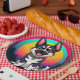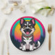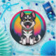 Ilustracion de un animado perro de dibujos animados sentado frente a un colorido fondo de arcoiris, con un ambiente lúdico y rodeado de un paisaje forestal sereno, que resalta la alegría y la vibrante arte.