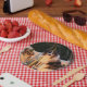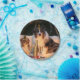 Design presenta una fotografía humorística de perros vestidos para celebrar Nochevieja. Están sentados en una manta peluda y llevan gorras fiestas. Una botella de champán está abierta delante de ellos.