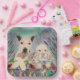 Memorial acuarela de perros dulces, con colcha multicolor y fondo de lavanda