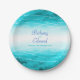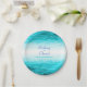 Platos de papel de mar de acuarela costera con superposición de olas gráficas y nombres de boda personalizados. Una excelente adición personal para sus mesas de boda junto a la playa o para snacks después de la boda o una fiesta posterior a la boda. Personalice con los nombres de la novia y el novio. Perfecto para boda de tema playero o de destino, compromiso o aniversario. Pintado de forma única en acuarela y diseñado por Sarah Trett para www.mylittleedenweddings.com