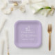 Este plato personalizado de papel de bonito color púrpura pastel de papel para bebés presenta una elegante tipografía minimalista blanca debajo de un bonito juguete de mecedoras. Decoración de escritura moderna y sencilla para una ducha de bebé.