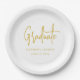Moderno y moderno plato de papel blanco del personalizado del Partido de Graduación de Guión de oro elegante Diseño Minimalista Celebra tu graduación con estilo con este moderno y moderno plato de papel de graduación de guiones con un elegante fondo blanco y elegante guión negro. El diseño minimalista es perfecto para una moda y una celebración contemporánea de graduación. Personalice con facilidad el uso de las plantillas de personalizados, añada el nombre de su graduado, la escuela secundaria o la universidad, y el año de clase en segundos. Ideal para fiestas de graduación, casas abiertas y eventos memorables. Diseñado por la artista Catherine Sweetman, este diseño exclusivo aporta sofisticación moderna a la decoración de las mesas. Perfecto para los que buscan una estética limpia y elegante con un toque personal.