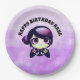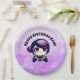 Platos de papel de fiesta de cumpleaños de chicas con temática de juegos morados y negros.