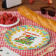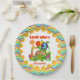 A los niños que cumplen tres años y aman a los animales, especialmente a los animales de safari o zoológico, les encantarán estos coloridos platos de papel de cumpleaños temáticos de safari que incluyen plantas y árboles de la jungla, una jirafa, león, globos de cumpleaños, sol, texto que dice Look Who's 3, un borde de rayas de chevron azules, verdes, naranjas, marrones y blancas, ¡y un anillo decorativo amarillo! ¡Puedes fácilmente agregar el nombre de tu hijo para personalizar estos platos de papel de 3er cumpleaños de safari!