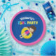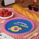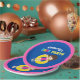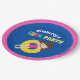 Los niños maravillosos reúnen platos de fiesta para una fiesta de cumpleaños de chicas en verano. Presenta un brillante y divertido pop de colores en un fondo azul marino. Chica de la morena de natación en un tubo interior amarillo. Personalizar con el nombre de su hijo.
