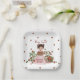 "Set the table with sweetness using these adorable personalized paper plates, designed specifically for Samantha's 'Berry Sweet' Baby Shower! Each square plate features a delightful illustration of a charming little girl holding a basket of strawberries, accompanied by our whimsical snail carrying a strawberry house, and lush strawberry vines.