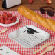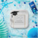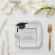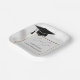 Host a sophisticated and modern graduation celebration with our custom square paper plates. This elegant design features a clean white background with a faint geometric tile pattern, anchored by a sleek gold-toned square border. In the top corner, a classic black graduation cap with a tassel is subtly placed. The center is waiting for your personalized details. Using the Zazzle 'Personalize' tool, you can easily replace the template text with the graduate's name, their specific class year, and the name of their high school or university. Shown here as placeholders are 'Emma Grace,' 'Class of 20XX,' and 'Lincoln High School'. This refined design is perfect for both high school and college graduations. These high-quality paper plates add a unique and personal touch to your celebration, making for a memorable keepsake for your guests. Pair with our matching napkins and cups for a cohesive look.