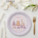 Celebrate your little one’s special day with this adorable lavender gingham paper plate featuring a charming watercolor illustration of classic baby toys — a teddy bear, giraffe, bunny, duck, and building blocks. The soft pastel palette and gentle checkered background create a cozy, vintage-inspired look perfect for baby showers, first birthdays, or gender-neutral celebrations. Personalize it easily with your child’s name or event details to make your party setup extra sweet.