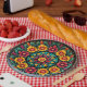 Convierte tu mesa en una fiesta floral con Petal Pop Serveware, la placa redonda que irradia alegría desde todos los ángulos. Los anillos concéntricos de flores rojas, amarillas, rosadas y naranjas brotan hacia el exterior de una flor central, enmarcada por verdes frondosos y ácidos acentos violetas. El fondo oscuro hace que los colores canten, mientras que la simetría permite que el refrigerio parezca digno de un altar. Ya sea sirviendo tamales, pan de Muerte o dulces para los espíritus, este plato aporta energía vibrante y estilo de arte folclórico a cada bocado. Es una celebración de la vida, la tradición y el tipo de artesanía que hace que incluso las papas fritas se sientan ceremoniales.