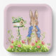 Peter el Conejo en su jardín revisando su casa de pájaro.