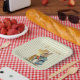 Peter el conejo recogiendo verduras con un fondo de rayas de salvia verde y crema Primer cumpleaños saludo