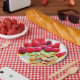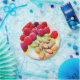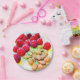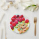 Placas de papel con una fotografía digital de almendras y frambuesas. Se agregó un filtro de acuarela a la foto original. Haga clic en Personalizar para seleccionar un estilo de fuente, tamaño y color que prefiera.