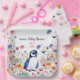 Un lindo pingüino rodeado de flores rosadas, azules, naranjas y violetas color de agua chica ducha de ilustracion de papel personalizado.