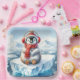 Un pingüino de acuarela adorable sentado en un iceberg con una bufanda roja, un gorra, y arbustos con copos de nieve.