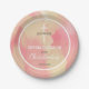 Este plato de papel rosa y dorado es una elegante adición a la cena navideña de una niña. El fondo de color rosa claro y dorado de las acuarelas se acentúa con una cruz blanca y un texto personalizado para el nombre del bebé y la fecha de la cristalización.