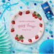 These cute "Berry Sweet" red, pink, and green strawberry themed baby shower paper plates with personalizable text are perfect for a baby girl baby shower party. It features red and green strawberry motifs on a pink background and text that you can customize with names.