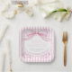 This pink bow baby shower coquette striped square baby shower paper plate design features soft pink stripes, a large bow and ribbons, and delicate frame details. Perfect for a feminine celebration, it creates a charming, preppy, and elegant look that feels sweet, stylish, and timeless. Created by Simply Farmhouse Press.
