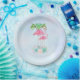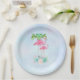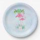 Platos de papel con un ilustracion de mami y flamencos rosados sobre una cama de flores suculentas florales con palmeras verdes que se balancean por la espalda. Tropical y bonito. El fondo es azul claro.