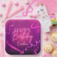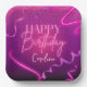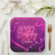 Platos modernos y ultra festivos de Papel Happy Birthday con confeti rosa y morado, piezas curvadas de cinta rosa y morada y luces de neón rosado. El fondo está decorado con un degradado moderno de rosa a violeta a negro. Personaliza con el nombre y ¡empecemos con el fiesta!