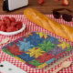 The quilt pattern showcases a vibrant mosaic of pinwheel and floral designs, with intricate patterns and a rich color palette that create a visually striking effect