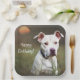 Estas placas de papel de cumpleaños presentan un bonito pitbull blanco.