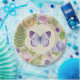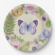 Hermosa mariposa púrpura rodeada de flores, helechos, una libélula y una mariposa amarilla de bonito.