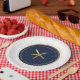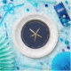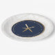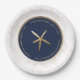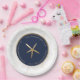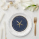 Este elegante y moderno plato de papel para bebé tiene un ilustracion de estrellas de mar y de dólares de arena sobre un fondo blanco. En primer plano hay un círculo azul marino con una estrella de mar dorada (Relieve metalizado simulado) en el centro. El texto alrededor del borde se puede personalizar a su gusto. Una bonita y elegante forma de complementar una ducha acuática o de playa.