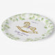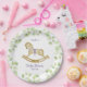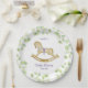 Placa de papel para la ducha de bebé, decorada con hermosos ilustraciones acuáticos de un adorable caballo mecedor rodeado de delicadas ramas con hojas verde claro.