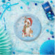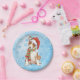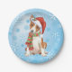 Celebra la temporada navideña con un lindo cachorro Basenji vestido con un sombrero de Santa y una bufanda rodeados de copos de nieve y con las palabras: ¡Feliz Día de Amanecer!