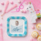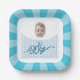 Celebra a un chico de recién nacido con este plato de papel azul y blanco que orgullosamente muestra las palabras "¡Es un chico!"