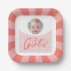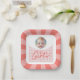 Adorable placa de papel rosa y blanco personalizada con el nombre de una niña, perfecta para una memorable ducha de bebé.