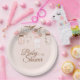 Esta placa de la fiesta de bienvenida al bebé de la diversión tiene un tarro de albañil y florece el tema que es perfecto para una ducha de la niña. En el top, hay una rama con las porciones de flores marrones blancas, rosadas, y de color topo con dos pájaros que se sientan en la rama. El colgante de la rama es tres diversos tarros de albañil. En la parte inferior, Baby Shower se escribe en una fuente elegante. Copyright GraphicMarket