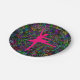 Diseño de danza por la paz con una bailarina rosa caliente en el centro rodeada de signos de paz multicolores.