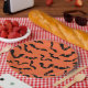 Placa de papel de la fiesta de Halloween mostrada con una huella de murciélago. Personalizar este artículo o compra tal cual. Imagen de stock vecteezy.com
