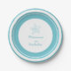 Las estrellas acuáticas y blancas del mar añaden nombres bodas a los platos de papel. Una gran adición personal a las mesas de su boda o para las bebidas bodas o un boda después del fiesta. Personalice los nombres de sus novias y novios. Perfecto para una boda en la playa con temática azul acuático o boda costero, compromiso o aniversario. Dibujo y diseño únicos de Sarah Trett.