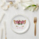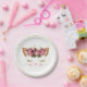 La placa de papel de la fiesta de bienvenida al bebé dulce hecha en blanco, con los gráficos de un oro bordea ligeramente alrededor del borde externo. Los gráficos de una cara adorable del gatito con la nariz en forma de corazón rosada, los latigazos de oro grandes del ojo y los oídos, con las flores rosadas, adornan el centro de la placa. Personalizar para añadir cualquier texto que usted quiera. Los productos a juego están disponibles.
