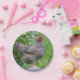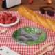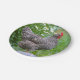 En este plato hay una gallina de roca de paja posando sobre un hongo de madera. Ideal para fiestas y picnics. Elige tu plato de talla.