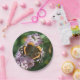 Este impresionante plato de papel muestra una fotografía de una hermosa mariposa del Almirante Rojo. Esta especie es principalmente negra con parches naranjas vívidos en cada ala junto con manchas blancas. La mariposa está sentada en un pico de flores de la bonito de Buda morada disfrutando de un poco de néctar. La fotografía fue tomada usando macrofotografía para obtener un resultado asombrosamente detallado.