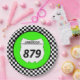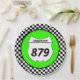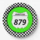 Portón trasero con estilo en su próxima carrera de motocross con platos personalizados. Estos platos tienen un número de placa blanco que está listo para ser personalizado con su nombre y número de bicicleta. La placa numérica se coloca sobre un fondo verde brillante con un borde de bandera a cuadros negros y blancos.