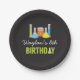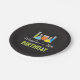 Placa de postre fiesta de ciencia azul, perfecta para el próximo experimento de cumpleaños de tus pequeños científicos. Fondo gris oscuro con unos cuellos de colores en verde, azul, amarillo y naranja.