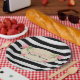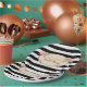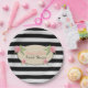 Estos modernos platos de papel a rayas florales son perfectos para una ducha de matrimonio en el jardín trasero.