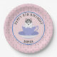Este plato de fiesta de cumpleaños personalizado presenta un ilustracion de un cachorro Husky Siberiano de ojos azules sentado dentro de un vaso de té. El juego de la taza de té púrpura tiene un patrón de punto de polka blanco. Los bordes exteriores de la placa fiesta tienen huellas de pata gris alrededor de ella. Personalice estas planchas de cumpleaños con su propio mensaje, año de cumpleaños y/o nombre de su hijo. El mensaje predeterminado es "Feliz octavo cumpleaños" y "Sophia".