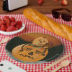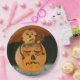 Diseño de Halloween lindo con una calabaza joven comiendo dulces de Halloween encima de la calabaza de papá no tan feliz. Platos de fiesta de Halloween negros y naranjas.
