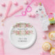 Las placas de papel boda se muestran en una hermosa impresión de flores rosa con nombres de ejemplo personalizados mostrados en un texto de color negro. Personalizar este elemento y cambia los nombres de ejemplo al suyo. Imagen de stock freepik.com