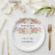 Las placas de papel boda se muestran en una hermosa impresión de flores rosa con nombres de ejemplo personalizados mostrados en un texto de color negro. Personalizar este elemento y cambia los nombres de ejemplo al suyo. Imagen de stock freepik.com