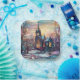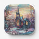 Un conjunto encantador de placas cuadradas de papel con la imagen de una iglesia de invierno de vidrieras.
