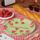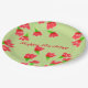 Fancy placas de papel de diseño de 9 pulgadas con un patrón de flores rojas. El texto de feliz cumpleaños puede ser personalizado en cualquier ocasión, o el texto es extraíble. El fondo verde claro se puede cambiar a tu propio color favorito.