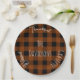 Personalizar tus platos de papel de Acción de Gracias de búfalo para tus vacaciones se reúnen. Presentando las palabras "Agradecidos, agradecidos, bendecidos" en un naranja de calabaza con platos de papel de chapa negra de búfalo.