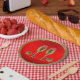 Platos fiestas de temática occidental con copas de champán con espuelas. El fondo es rojo y tiene un borde purpurina de oro FAUX. Vea este y otros diseños similares en otros suministros de fiesta en el Rodeo Days Store.